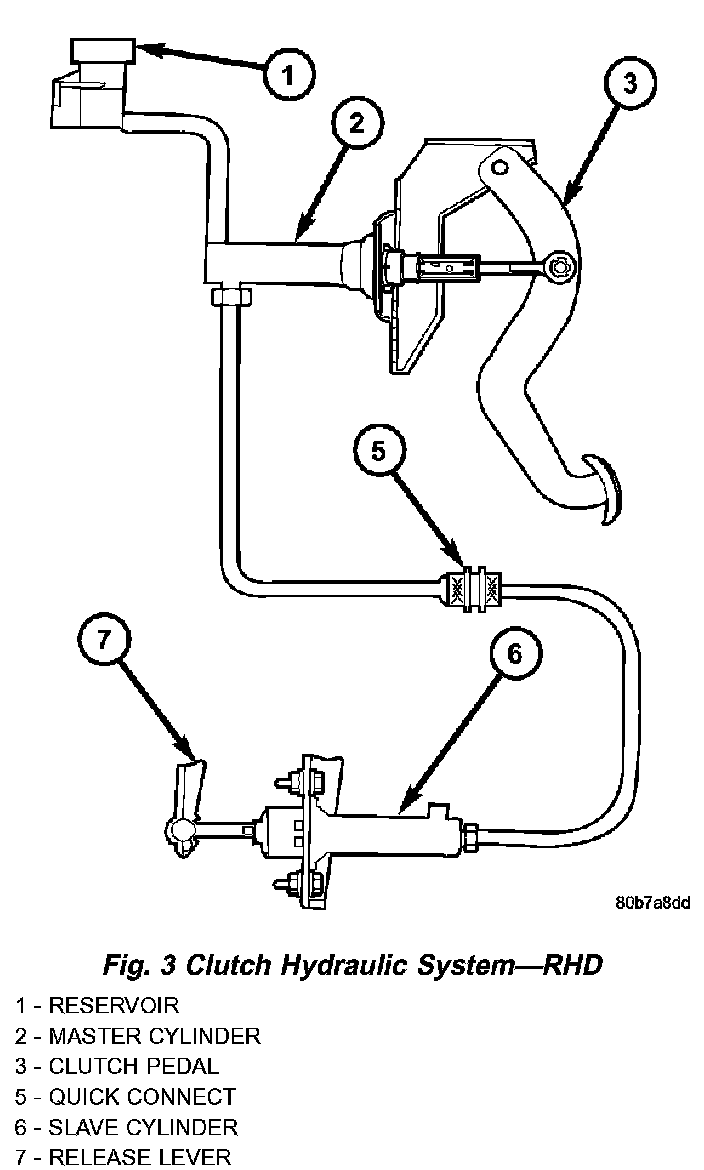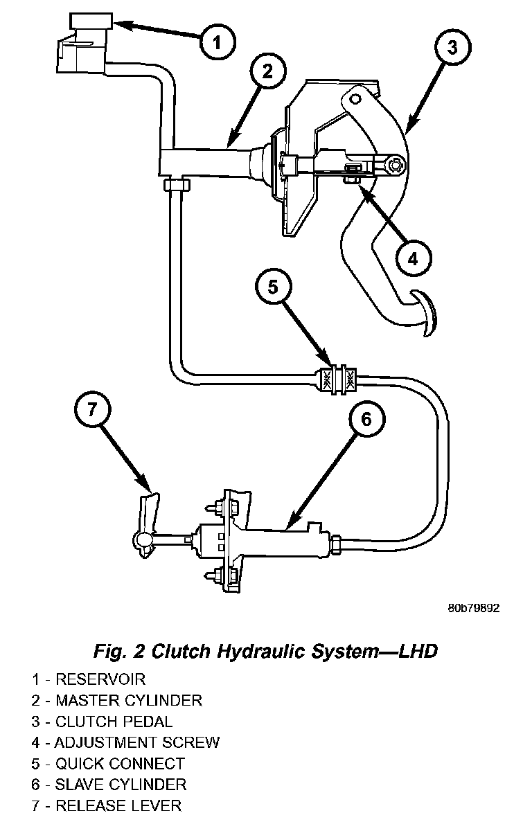 The clutch hydraulic system is responsible for engaging and disengaging the clutch. Depressing the clutch pedal develops fluid pressure in the clutch master cylinder. This pressure is transmitted to the slave cylinder through a connecting line. In turn, the slave cylinder operates the clutch release lever (Fig. 2) (Fig. 3)