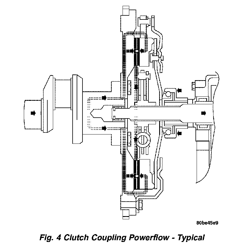 The clutch assembly is designed to transmit power from the engine to the manual transaxle. This is accomplished by the friction and clamping force generated when the spring loaded pressure plate locks the clutch disc to the flywheel (Fig. 4). The clutch disc, which is splined to the transaxle input shaft, transmits power until the center of the diaphragm spring is depressed, and the clamp force is removed from the disc.