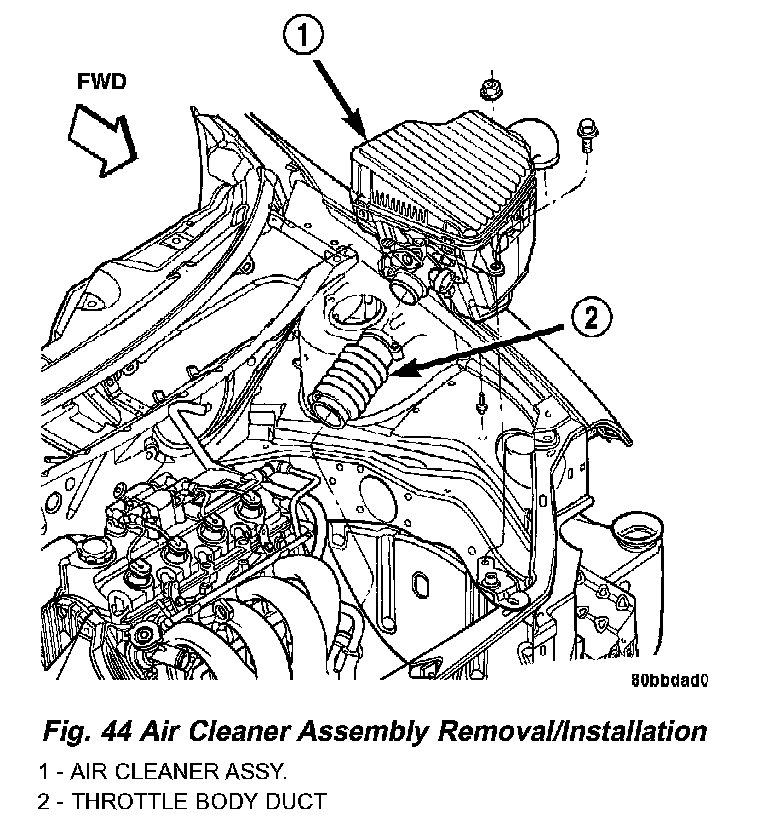 22. Install the air cleaner/throttle body assy. as follows (Fig. 44):