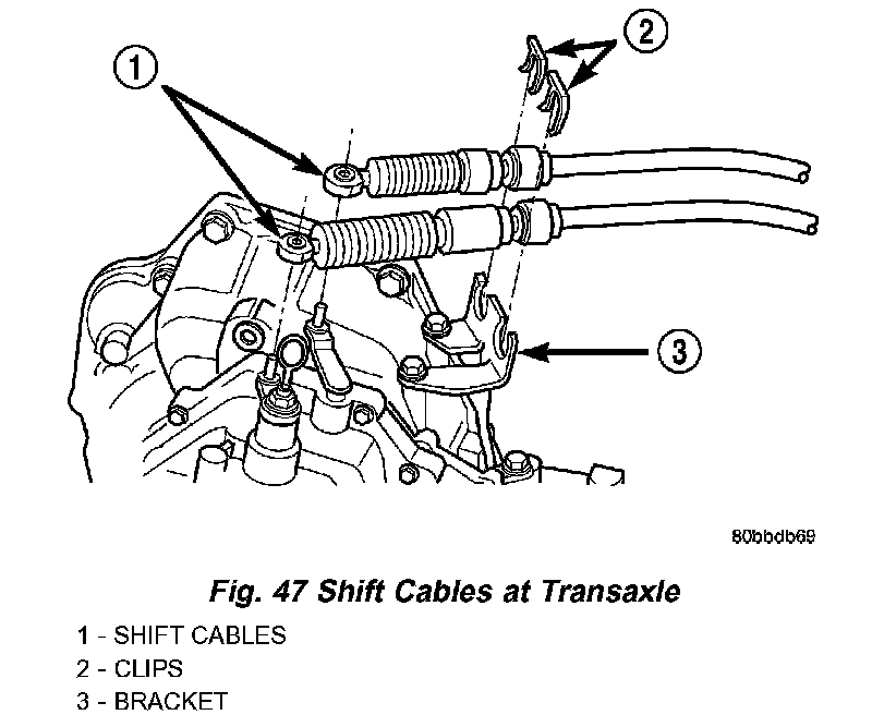 17. Connect shift crossover and selector cables to shift lever. Install cables to bracket and install retaining clips (Fig. 47).