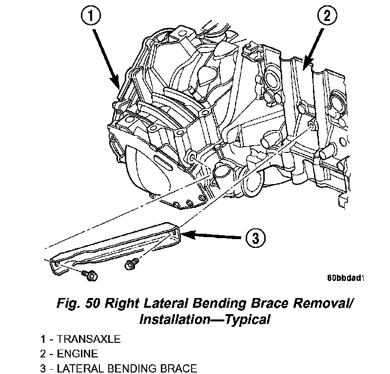 12. Install the right lateral bending brace and tighten bolts to 81 Nm (60 ft. lbs.) torque (Fig. 50).