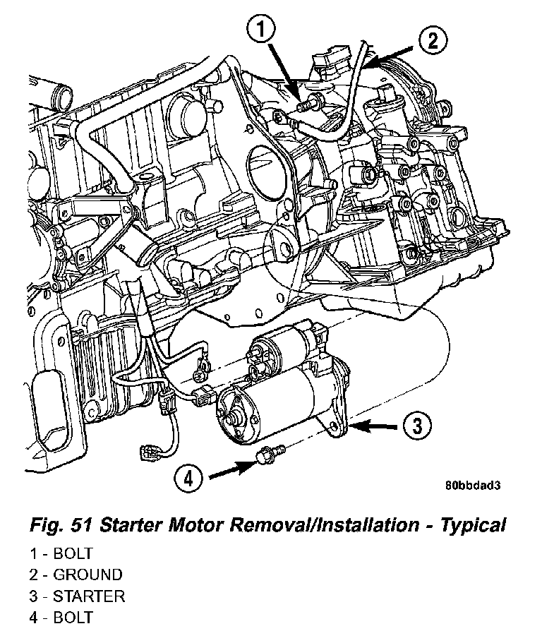 7. Install starter motor and tighten bolts to 54 Nm (40 ft. lbs.) torque. Make sure to fasten ground cable to upper starter bolt as shown in (Fig. 51).
