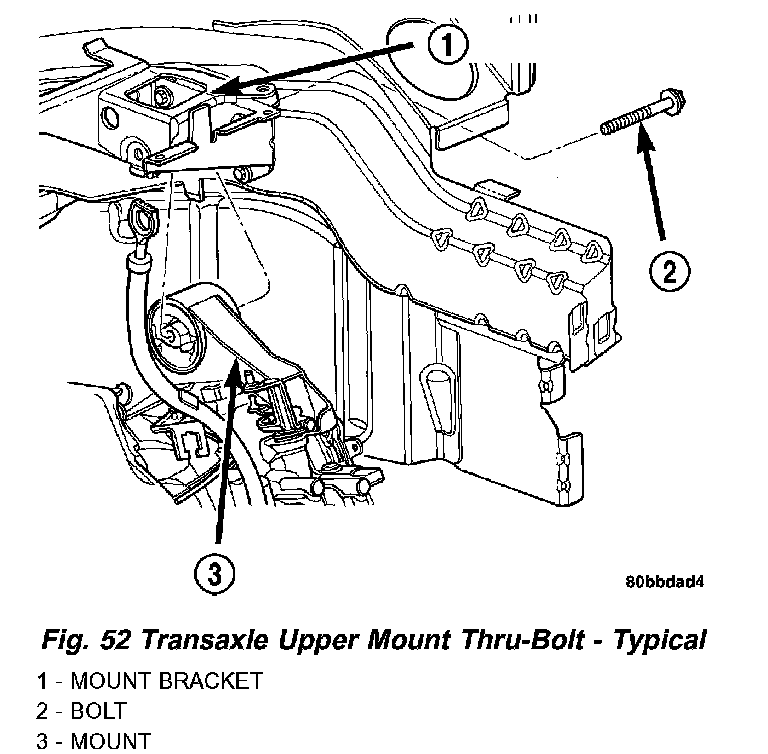 4. Raise engine and transaxle with screw jack until through hole in upper mount aligns with hole in mount bracket. Install mount bolt and tighten to 108 Nm (70 ft. lbs.) torque (Fig. 52).