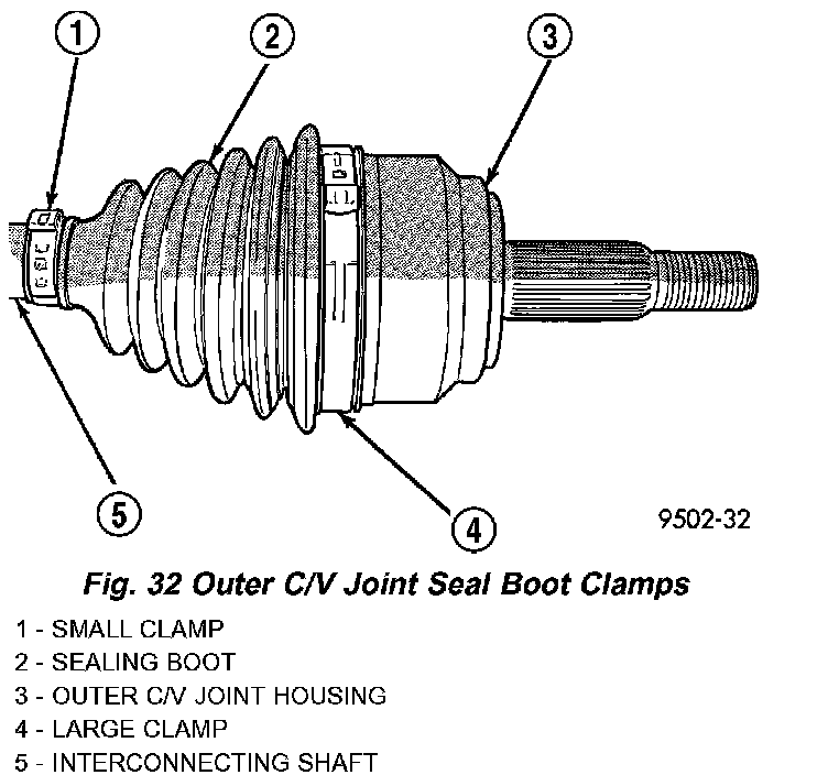 2. Remove large boot clamp retaining C/V joint sealing boot to C/V joint housing (Fig. 32) and discard. Remove small clamp that retains outer C/V joint sealing boot to interconnecting shaft and discard. Remove sealing boot from outer C/V joint housing and slide it down interconnecting shaft.
