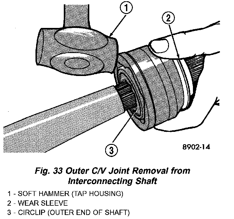 4. Remove outer C/V joint from interconnecting shaft using the following procedure: Support interconnecting shaft in a vise equipped with protective caps on jaws of vise to prevent damage to interconnecting shaft. Then, using a soft-faced hammer, sharply hit the end of the C/V joint housing to dislodge housing from internal circlip on interconnecting shaft (Fig. 33). Then slide outer C/V joint off end of interconnecting shaft, joint may have to be tapped off shaft using a soft-faced hammer.