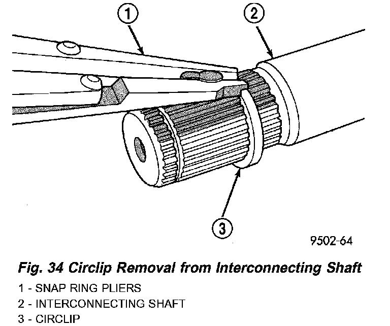5. Remove large circlip (Fig. 34) from the interconnecting shaft before attempting to remove outer C/V joint sealing boot.
