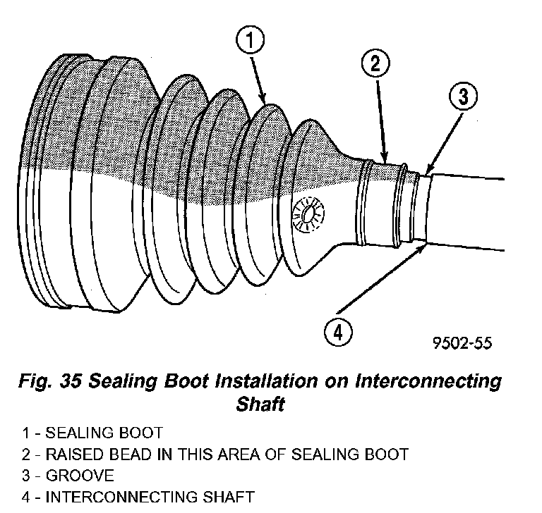 1. Slide new sealing boot to interconnecting shaft retaining clamp onto interconnecting shaft. Slide the outer C/V joint assembly sealing boot onto the interconnecting shaft (Fig. 35). Seal boot MUST be positioned on interconnecting shaft so the raised bead on the inside of the seal boot is in groove on interconnecting shaft.