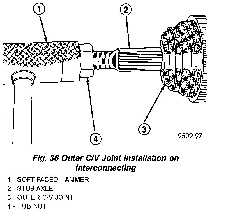 3. Install outer C/V joint assembly onto interconnecting shaft by using a soft-faced hammer and tapping end of stub axle (with hub nut installed) until outer C/V joint is fully seated on interconnecting shaft (Fig. 36).
