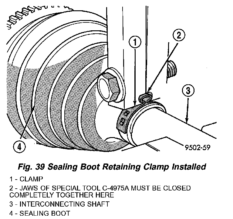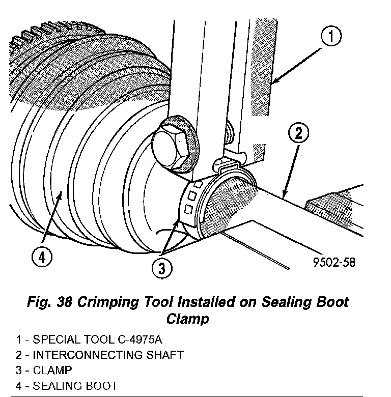 7. Clamp sealing boot onto interconnecting shaft using crimper, Special Tool C-4975-A and the following procedure. Place crimping tool C-4975-A over bridge of clamp (Fig. 38). Tighten nut on crimping tool C-4975-A until jaws on tool are closed completely together, face to face (Fig. 39).
