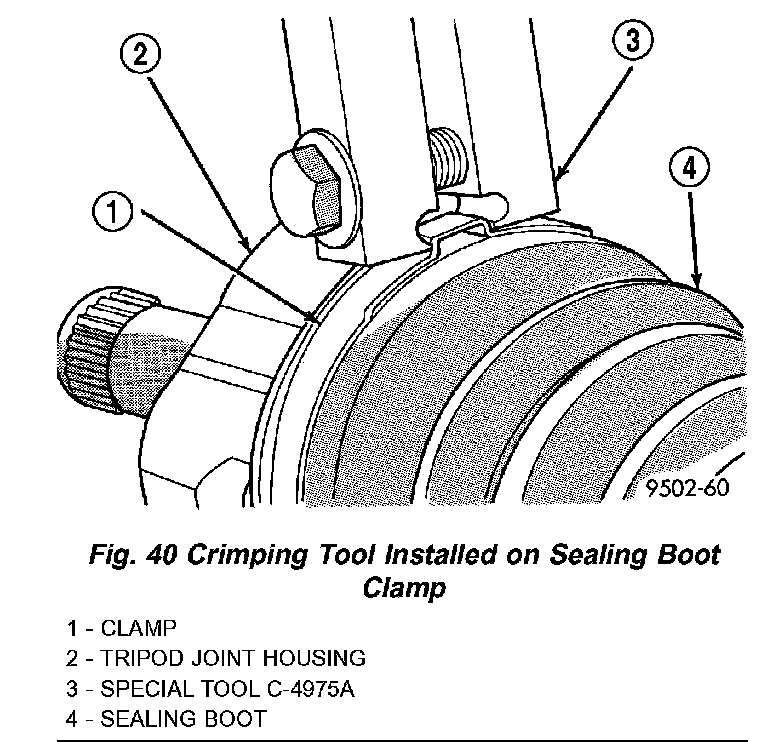 9. Clamp sealing boot onto outer C/V joint housing using Crimper, Special Tool C-4975-A and the following procedure. Place crimping tool C-4975-A over bridge of clamp (Fig. 40). Tighten nut on crimping tool C-4975-A until jaws on tool are closed completely together, face to face (Fig. 41).