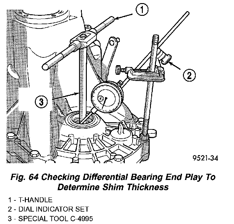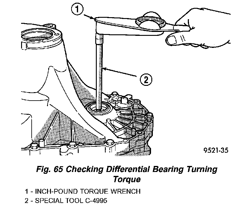10. Using Special Tool C-4995 and an inch-pound torque wrench, check turning torque of the differential assembly (Fig. 65). The turning torque should be 6 to 12 inch lbs.. If the turning torque is too high, install a 0.05 mm (0.002 inch) thinner shim. If the turning torque is too low, install a 0.05 mm (0.002 inch) thicker shim.