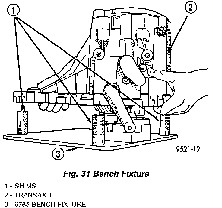 17. Using bench fixture and shims provided (Miller tools #6785, 6785-1, and 6785-2), turn transaxle over. Install transaxle onto bench fixture (Fig. 31). Verify shim spacers are in position on bench fixture. Install transaxle into shop press.