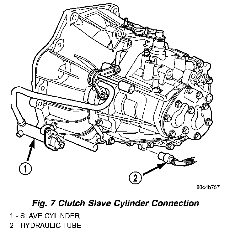 17. Connect clutch master cylinder to slave cylinder as shown in (Fig. 7). An audible "click" should be heard. Verify by pulling outward on connection.