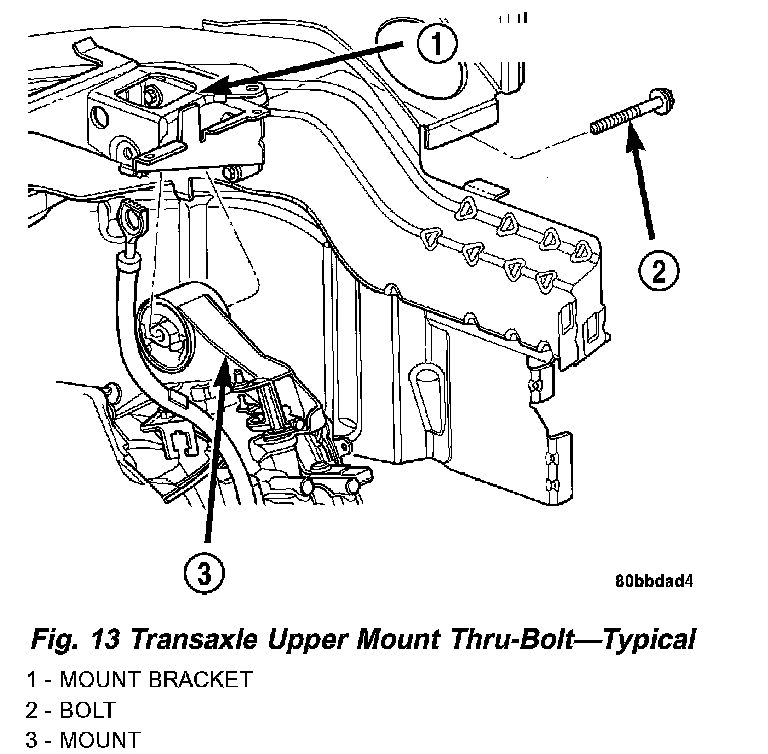 3. Raise engine and transaxle with screw jack until through hole in upper mount aligns with hole in mount bracket. Install mount bolt and tighten to 108 Nm (80 ft. lbs.) torque (Fig. 13).