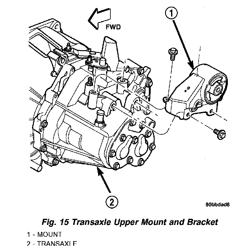 25. If installing a new or replacement transaxle, remove the upper mount as shown in (Fig. 15), transfer to the replacement unit and torque all bolts to 68 Nm (50 ft. lbs.) torque.