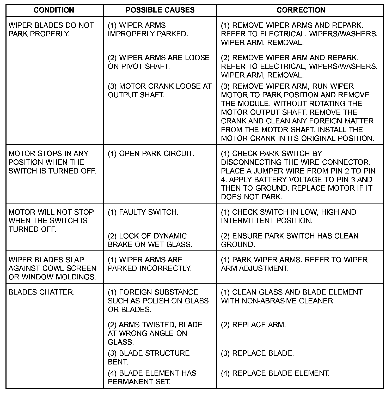 Whenever a wiper motor malfunction occurs, verify that the wire harness is properly connected, then start normal diagnosis and repair procedures. Refer to the WIPER MOTOR DIAGNOSIS table.
