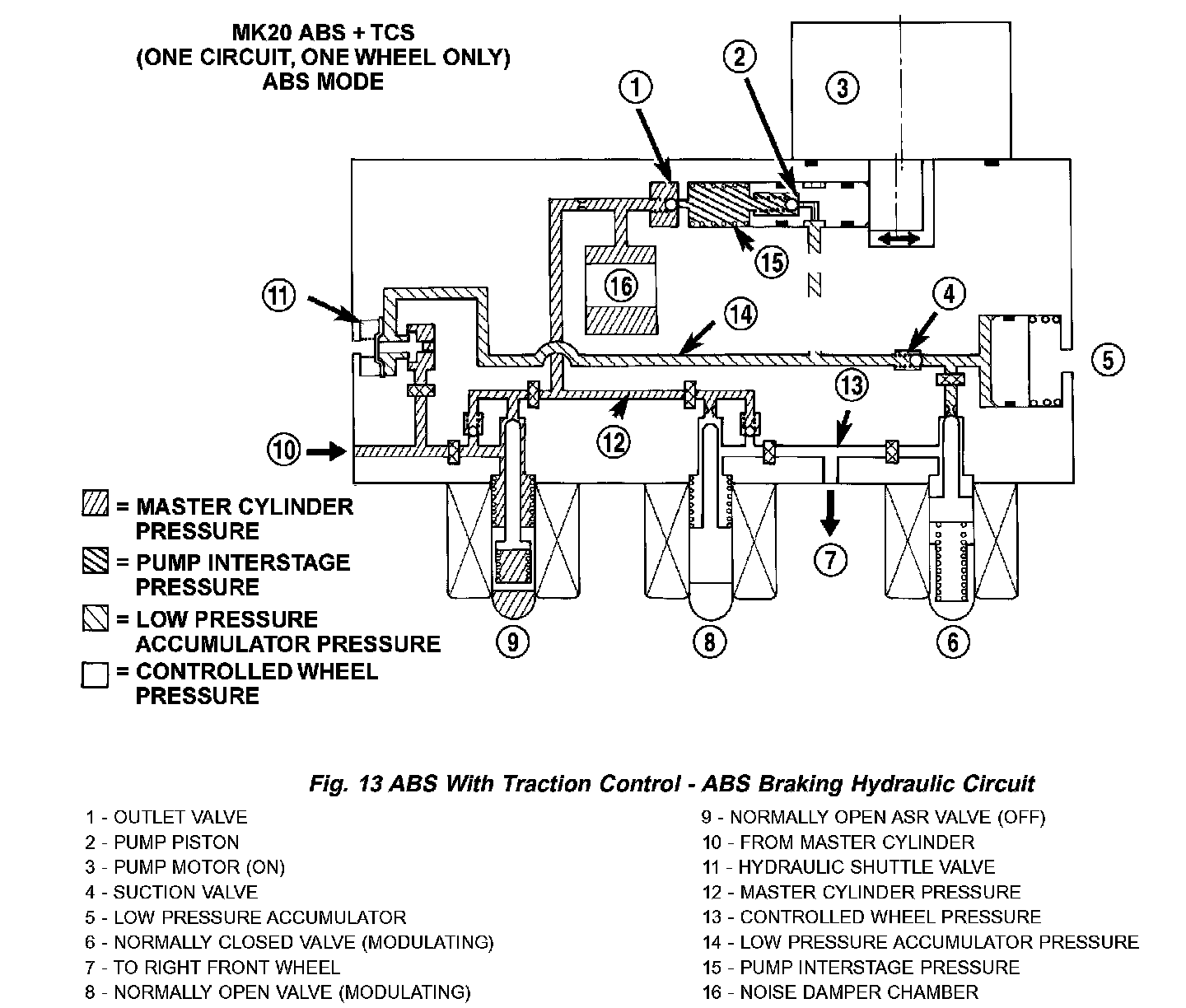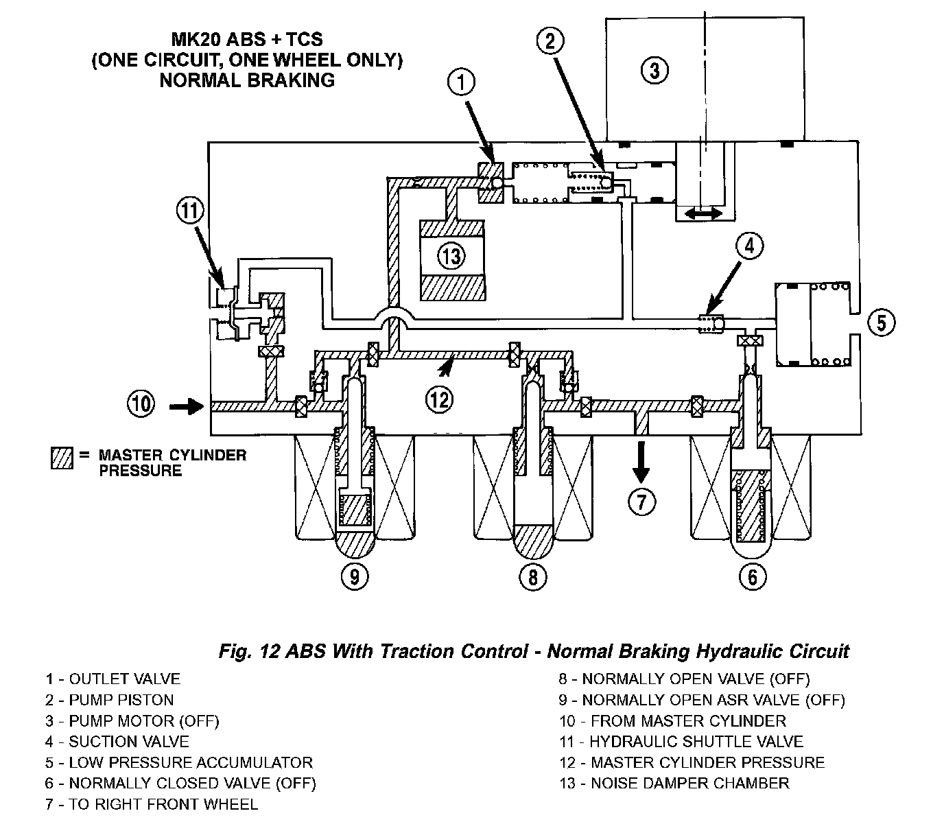 - The normally open TC (ASR) valve is energized to isolate the brake fluid being pumped from the master cylinder and to isolate the driven wheel.