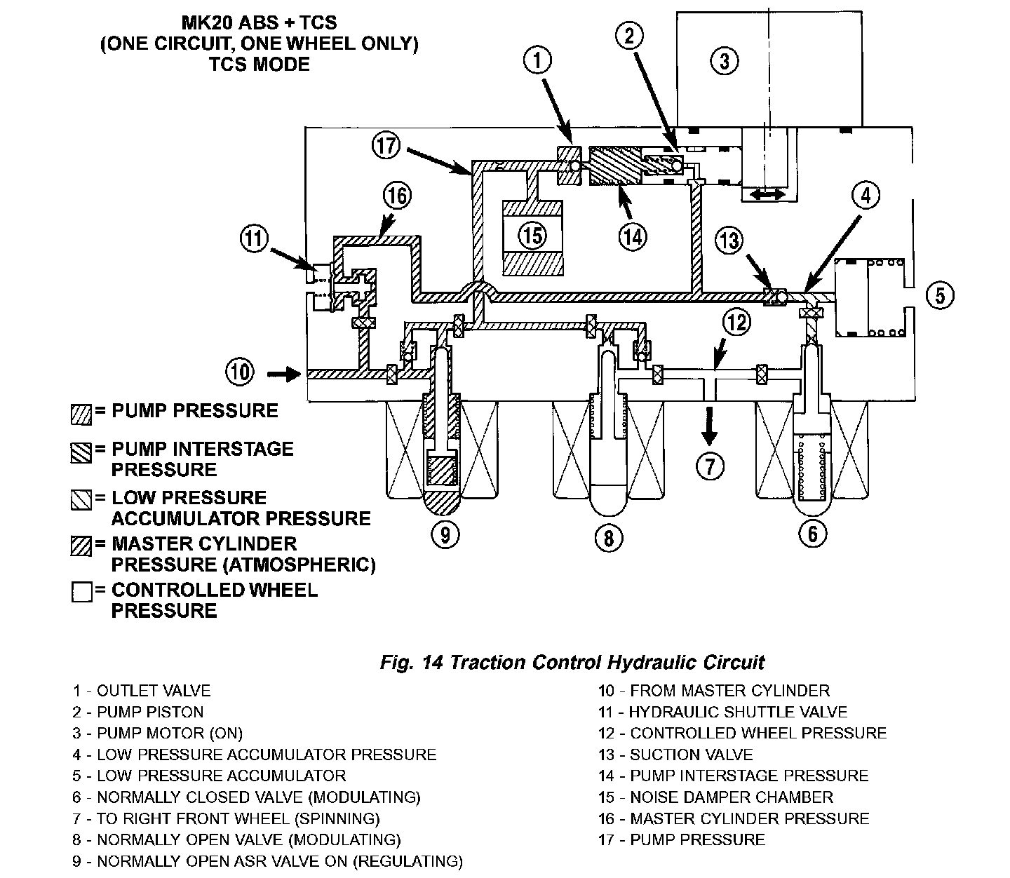 - The normally open TC (ASR) valve bypasses the pump output back to the master cylinder at a fixed pressure setting.