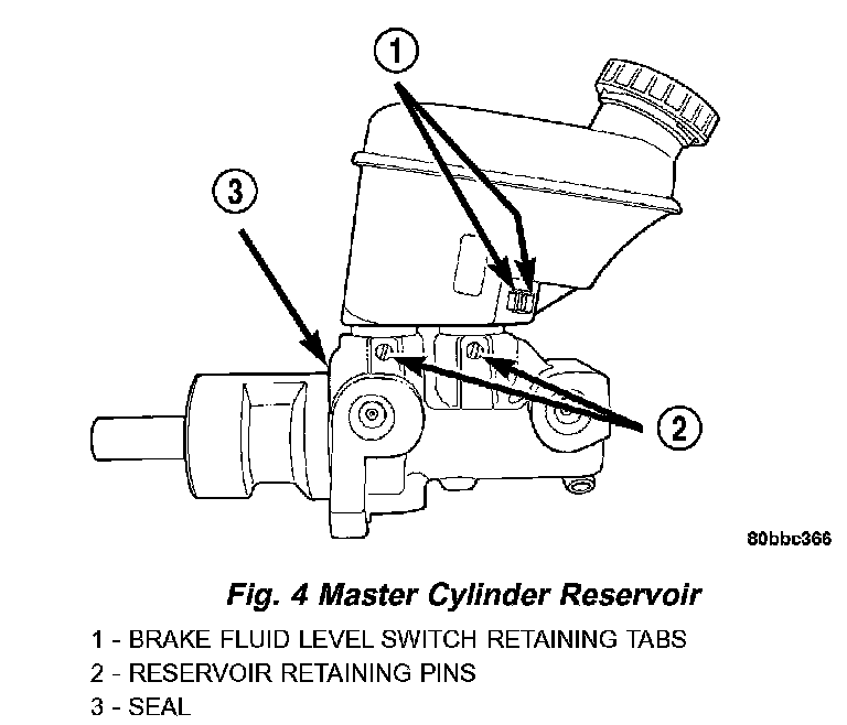 1. Remove the vehicle wiring harness connector from brake fluid level switch in master cylinder brake fluid reservoir.