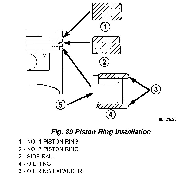 NOTE: The identification mark on face of upper and intermediate piston rings must point toward top of piston. Install rings with manufacturers identification mark facing up, to the top of the piston (Fig. 89).