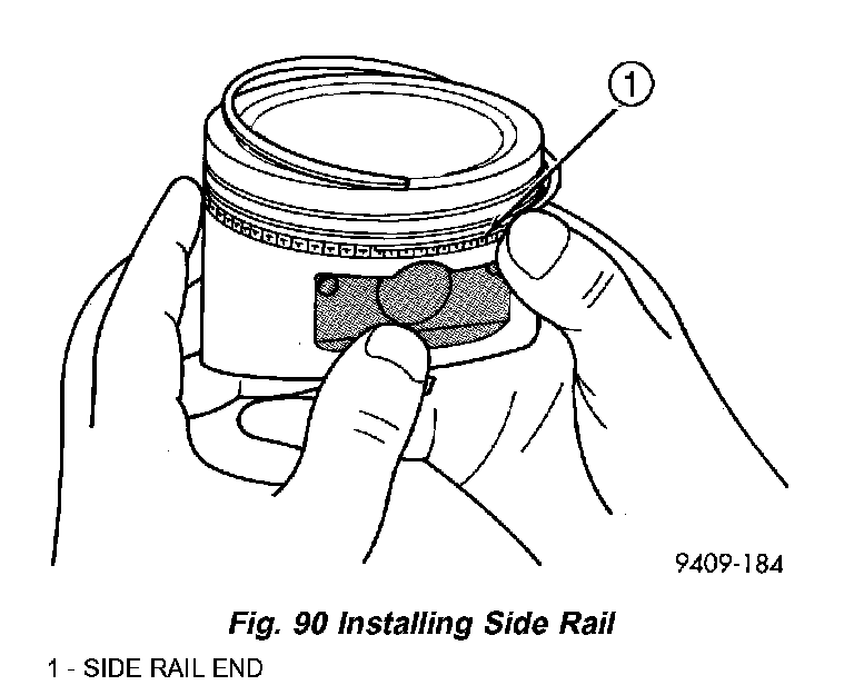 2. Install upper side rail first and then the lower side rail. Install the side rails by placing one end between the piston ring groove and the oil ring expander. Hold end firmly and press down the portion to be installed until side rail is in position. Do not use a piston ring expander (Fig. 90).