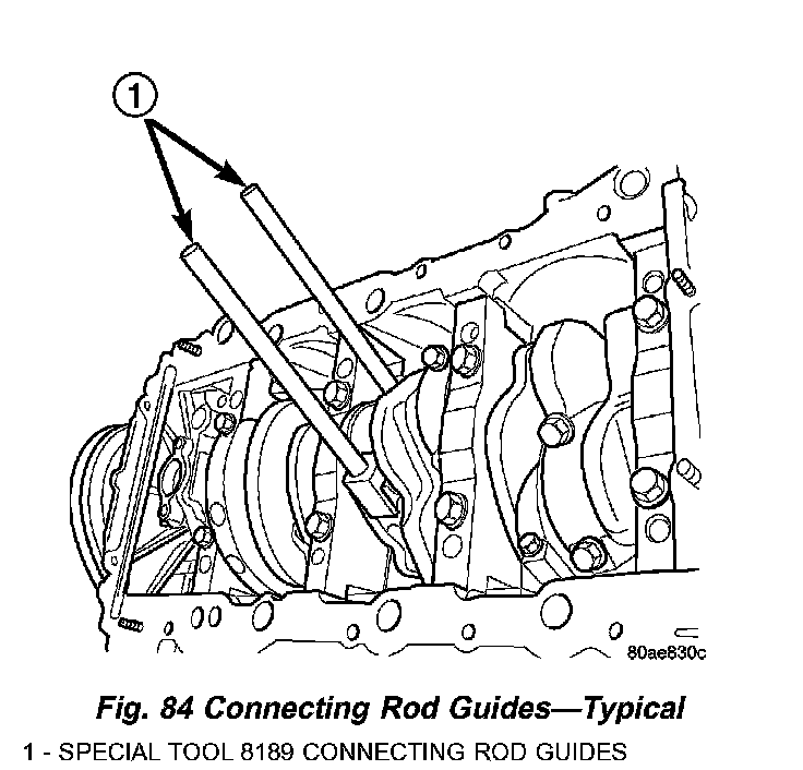 8. To protect crankshaft journal and fractured rod surfaces, install Special Tool 8189, connecting rod guides onto connecting rod (Fig. 84). Carefully push each piston and rod assembly out of cylinder bore.