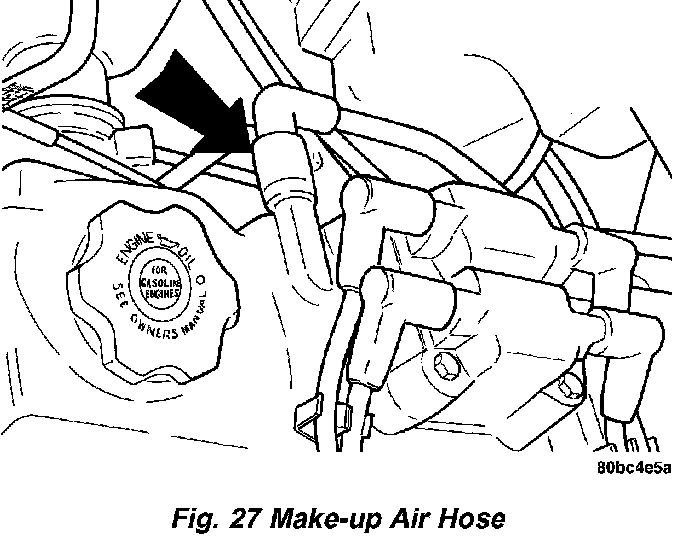 1. Disconnect make-up air (Fig. 27) and PCV (Fig. 28) hoses from cylinder head cover.