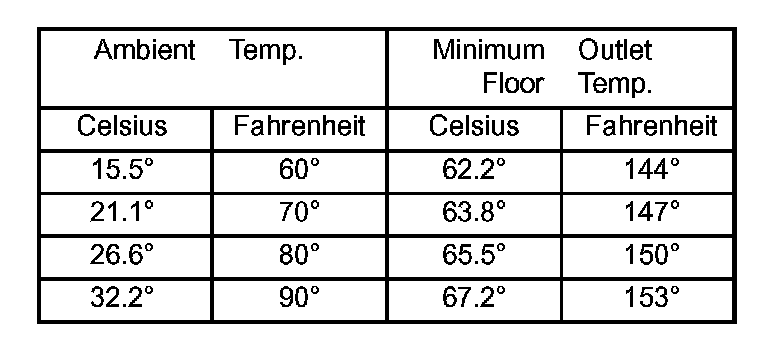 Engine coolant is provided to the heater system by two 16 mm (5/8 inch inside diameter) heater hoses. With engine idling at normal running temperature, set the control to maximum heat, floor, and high blower setting. Using a test thermometer, check the air temperature coming from the floor outlets, refer to Temperature Reference chart.