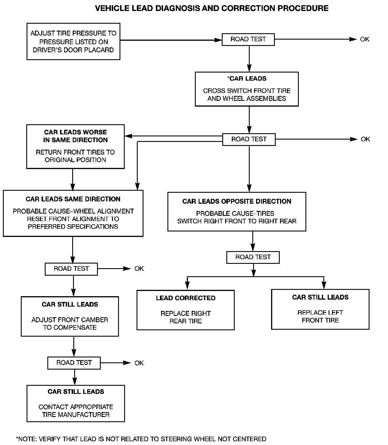 Use the following chart to diagnose a vehicle that has a complaint of a drift or lead condition. The use of this chart will help to determine if the lead condition is the result of a bad tire or is caused by the wheel alignment.