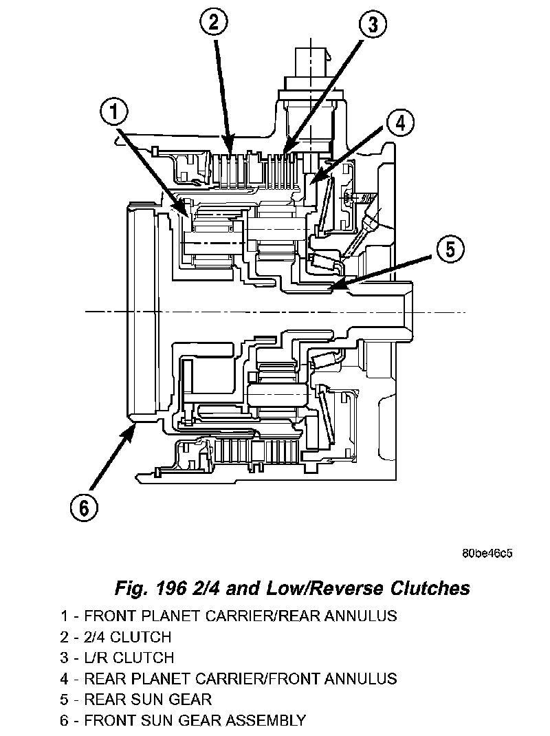 Two hydraulically applied multi-disc clutches are used to hold planetary geartrain components stationary while the input clutches drive others. The 2/4 and Low/Reverse clutches are considered holding clutches and are contained at the rear of the transaxle case. (Fig. 196).