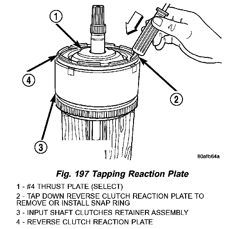 2. Tap down reverse clutch reaction plate to release pressure from snap ring (Fig. 197).