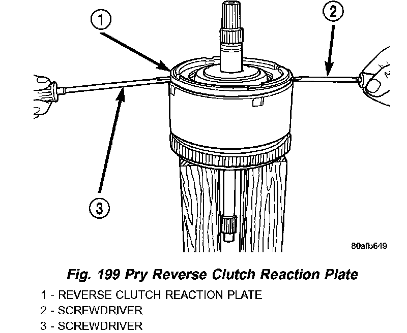 4. Pry up and remove reverse clutch reaction plate (Fig. 199) (Fig. 200).