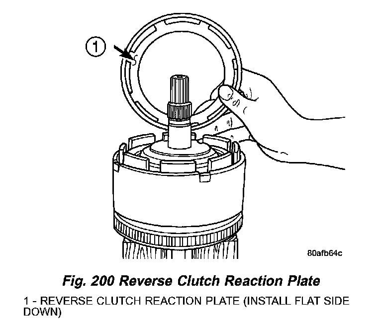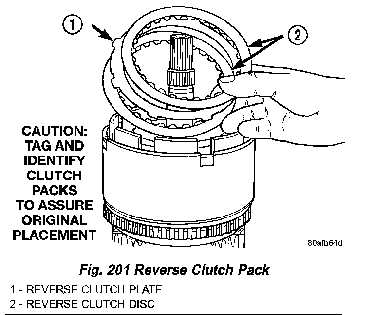 5. Remove the reverse clutch pack (two fibers/one steel) (Fig. 201).
