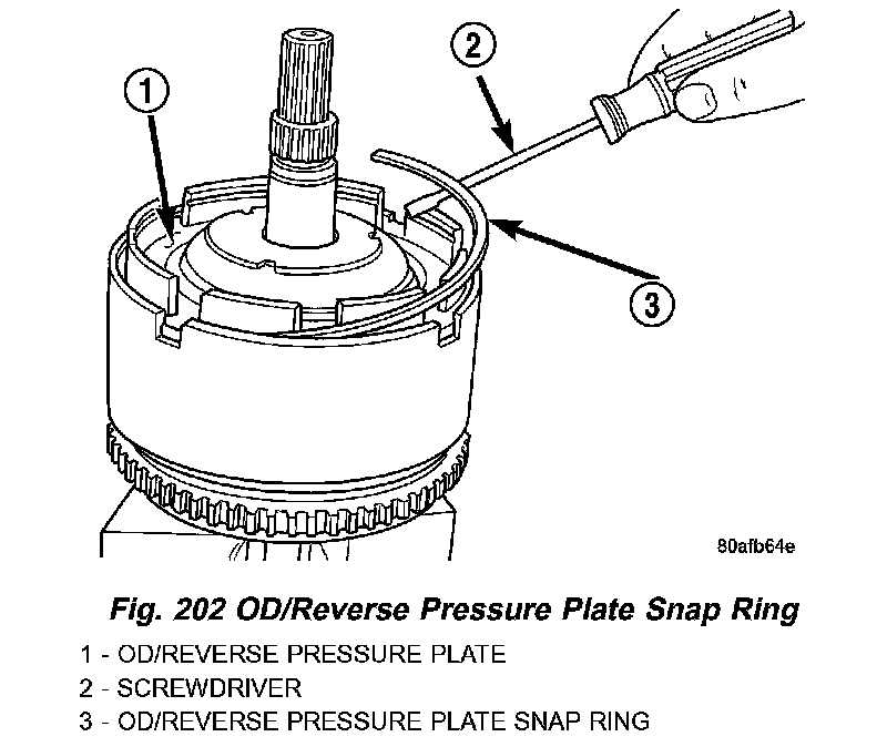 6. Remove the OD/Reverse pressure plate snap ring (Fig. 202).