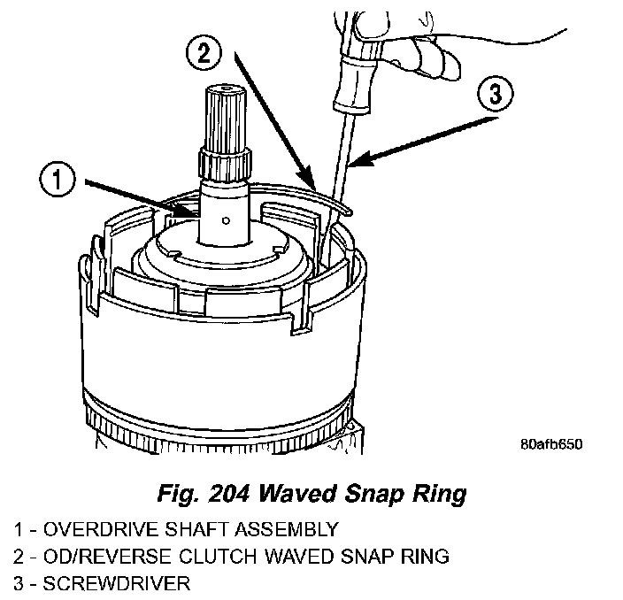 8. Remove OD/Reverse pressure plate wave snap ring (Fig. 204).