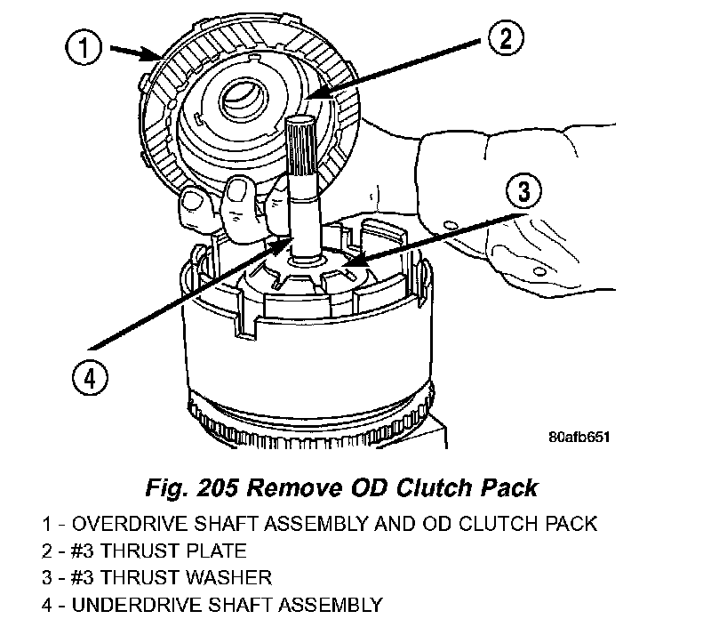 9. Remove OD shaft/hub and OD clutch pack (Fig. 205) (Fig. 206).