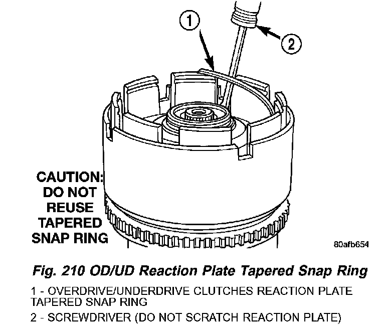13. Remove the OD/UD reaction plate tapered snap ring (Fig. 210).