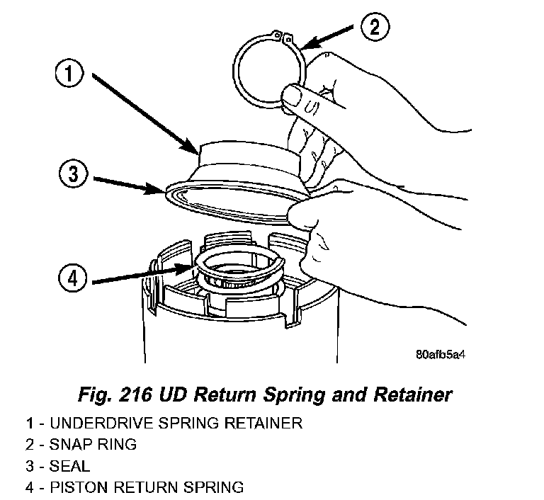 18. Using Tool 5059A and an arbor press, compress UD clutch piston enough to remove snap ring (Fig. 215) (Fig. 216).