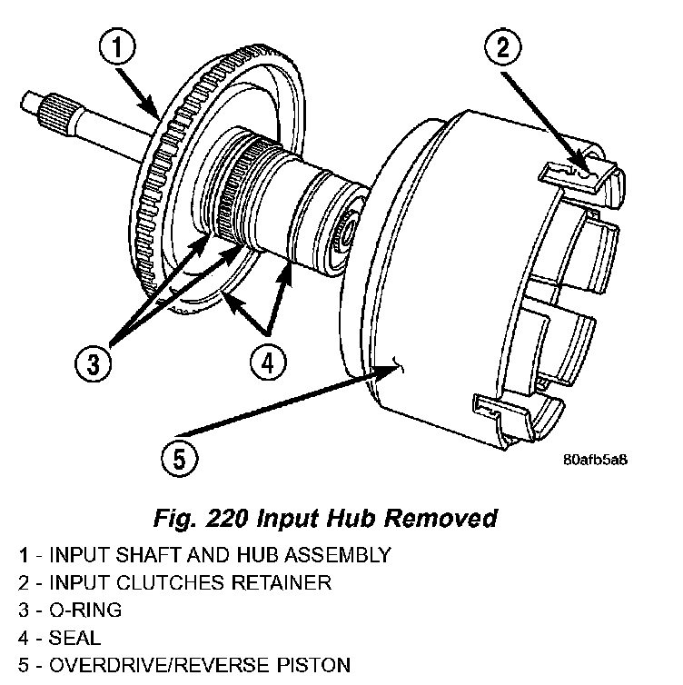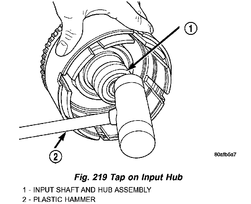 22. Tap on input hub with soft faced hammer and separate input hub from OD/Reverse piston and clutch retainer (Fig. 219) (Fig. 220).