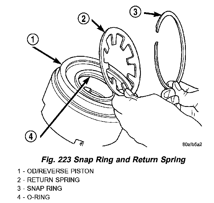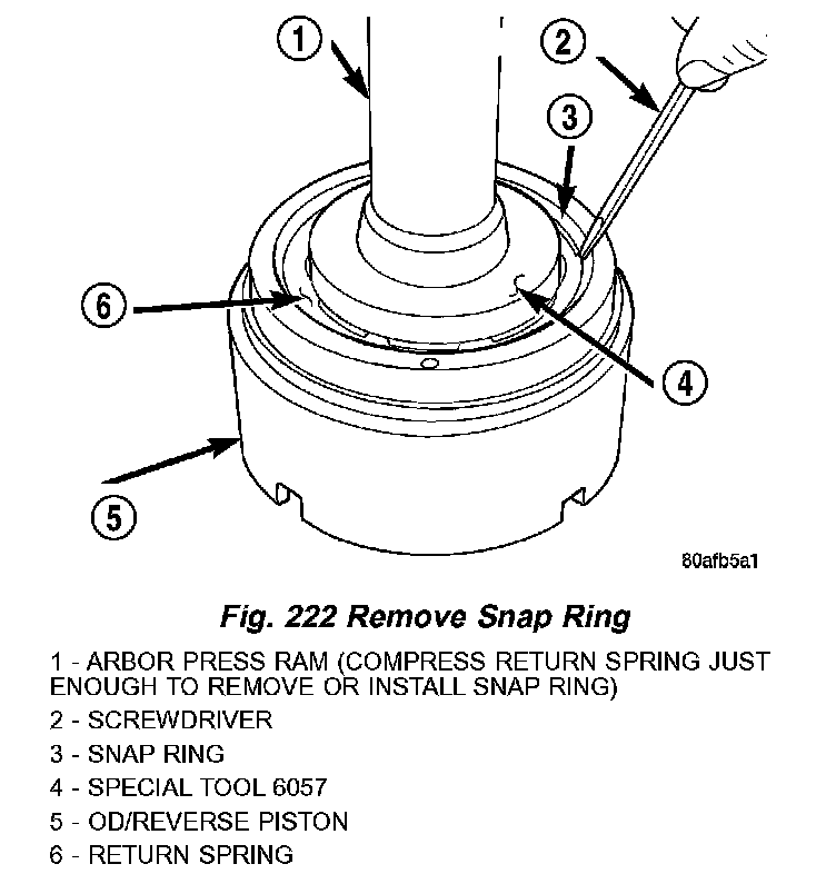 24. Using Tool 6057 and an arbor press, compress return OD/Reverse piston return spring just enough to remove snap ring (Fig. 222) (Fig. 223).