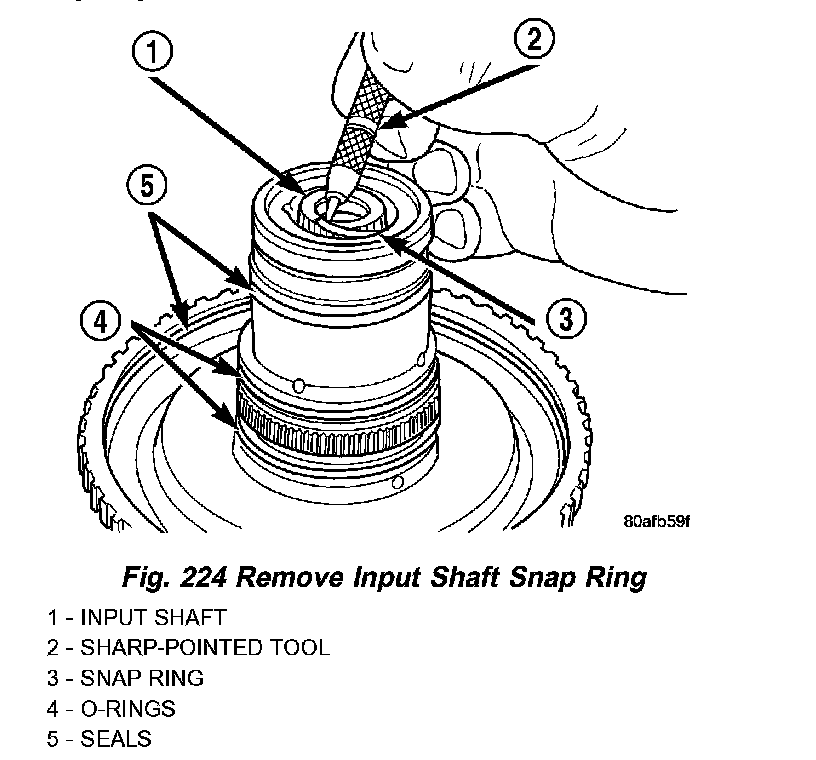 25. Remove input shaft to input clutch hub snap ring (Fig. 224).