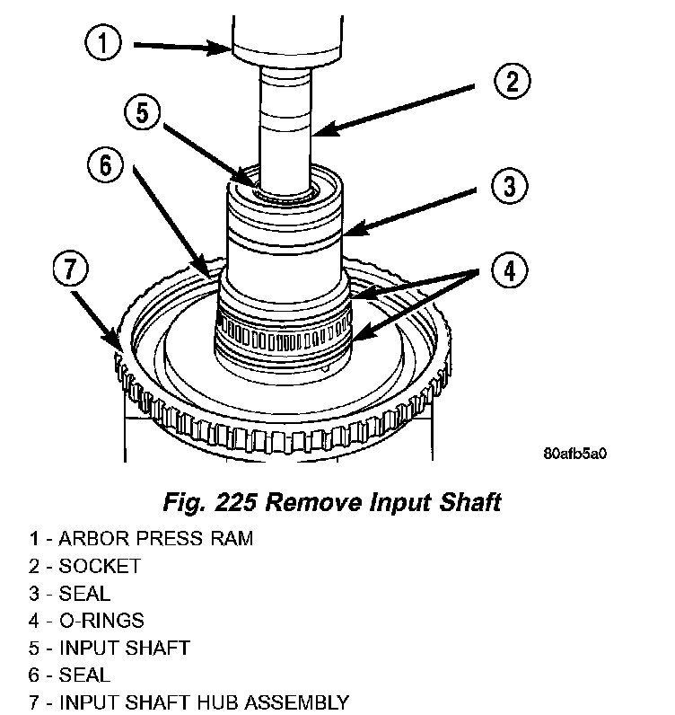 26. Using a suitably sized socket and an arbor press, remove input shaft from input shaft hub (Fig. 225).