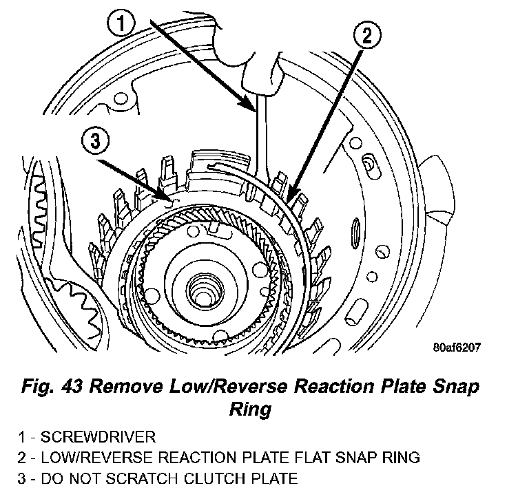 34. Remove low/reverse reaction plate snap ring (Fig. 43).