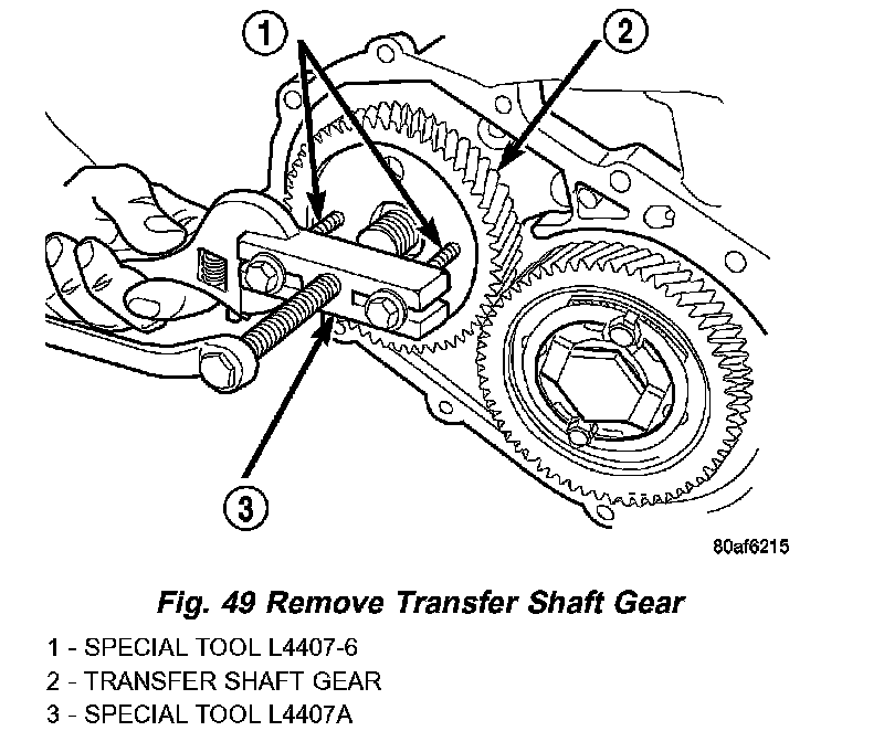 39. Using tool L-4407A, remove transfer shaft gear (Fig. 49).