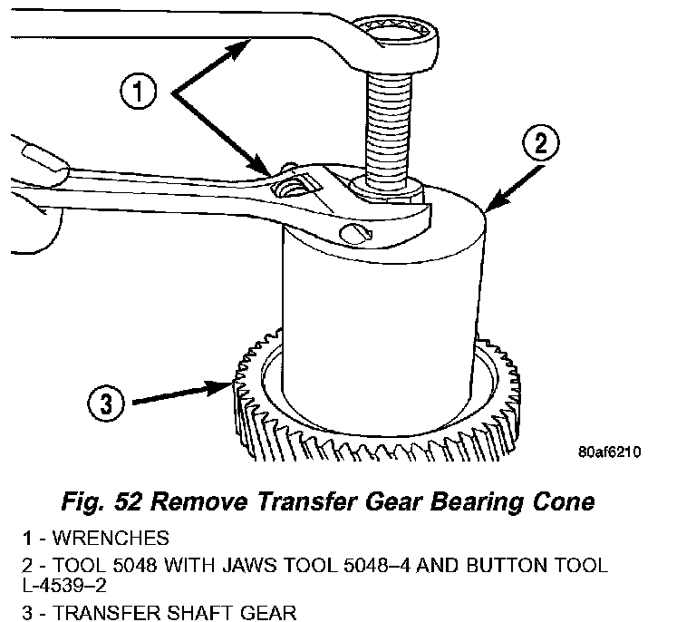 42. Remove transfer gear bearing cone using setup shown in (Fig. 52).