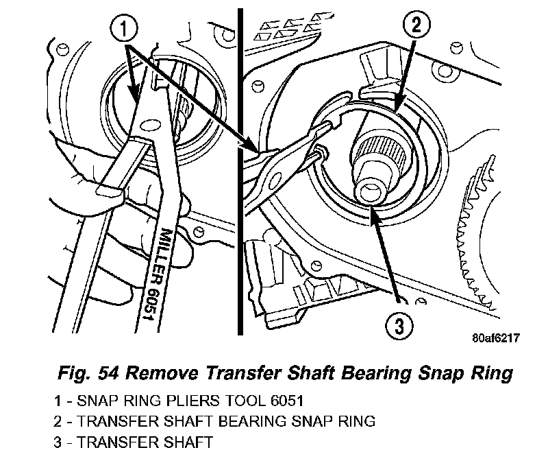 44. Using Tool 6051, remove transfer shaft bearing snap ring (Fig. 54).