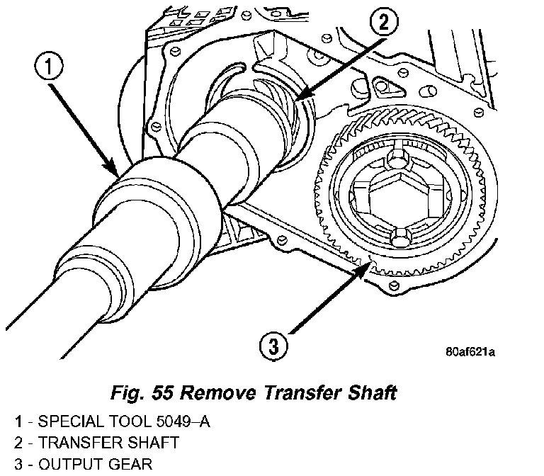 45. Using tool 5049A, remove transfer shaft from transaxle (Fig. 55)