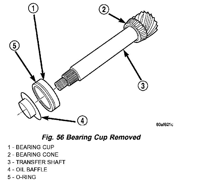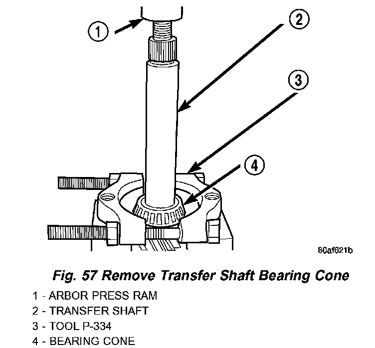 47. Using tool P-334, press transfer shaft bearing cone off of shaft (Fig. 57).