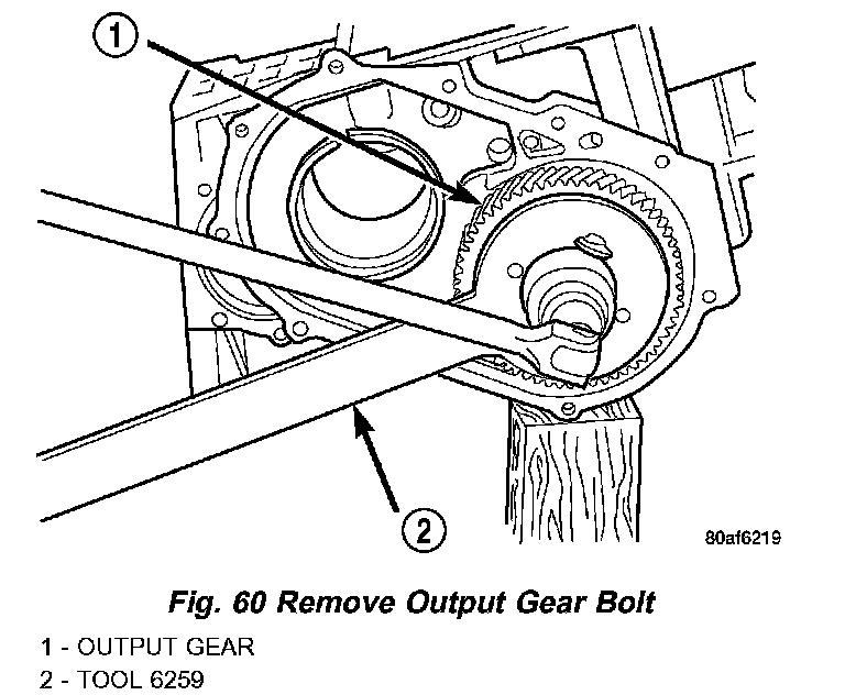 51. Using Tool 6259 (Fig. 60), remove output shaft ear-to-shaft bolt and washer (Fig. 61).