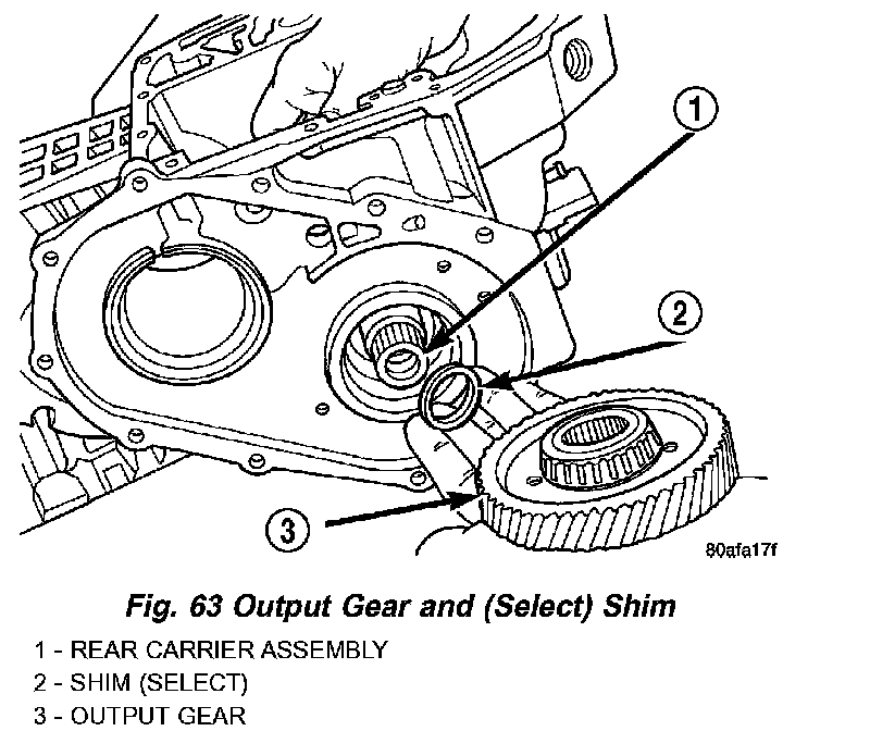53. Remove output gear bearing shim (select) (Fig. 63).